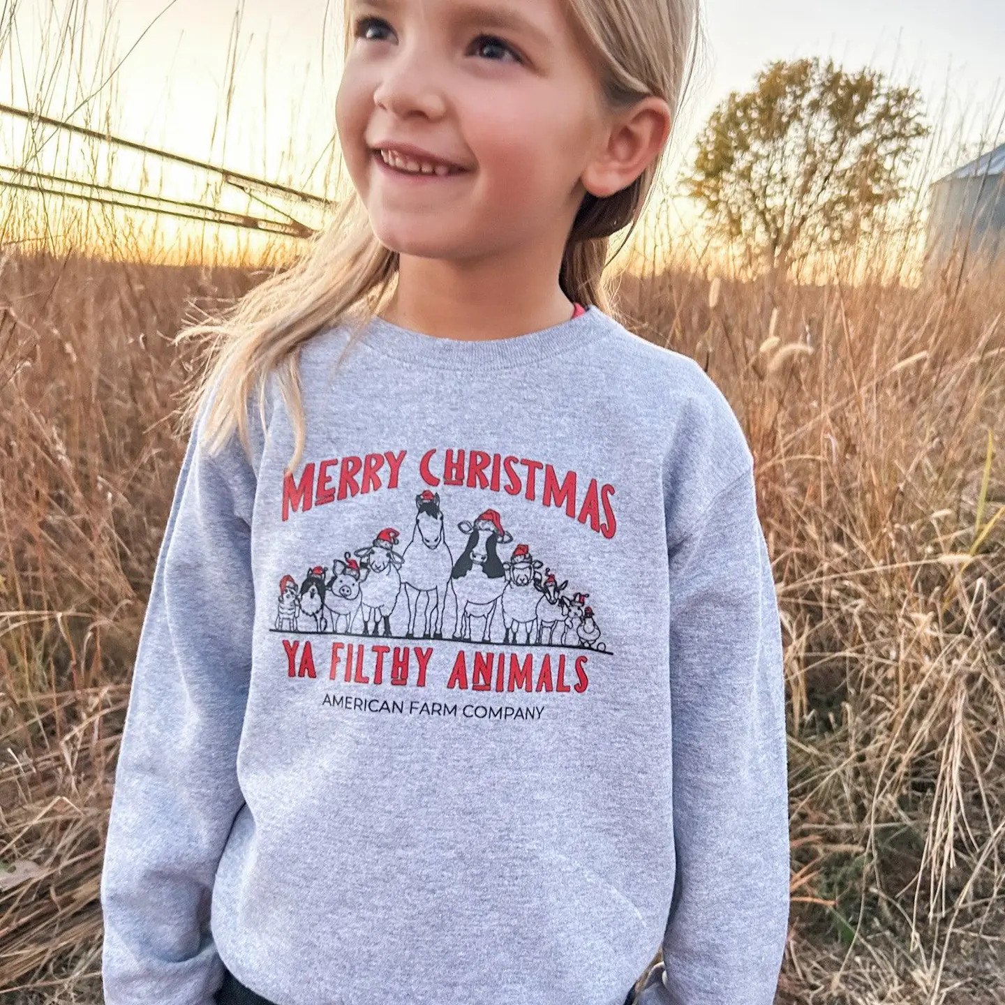 Get your little ones in the holiday spirit with our 'Merry Christmas Ya Filthy Animals Crew' toddler and youth crewneck! Featuring our best-selling design of farm animals dressed in festive attire, this must-have holiday attire will have your kids looking cute and stylish. Available in toddler and youth sizes. Specifications: Rabbit Skins Brand - Toddler Gildan Brand- Youth Heather/ Sport Grey Color 50% Polyester 50%Cotton true to size (Colors may vary based on different viewing devices)