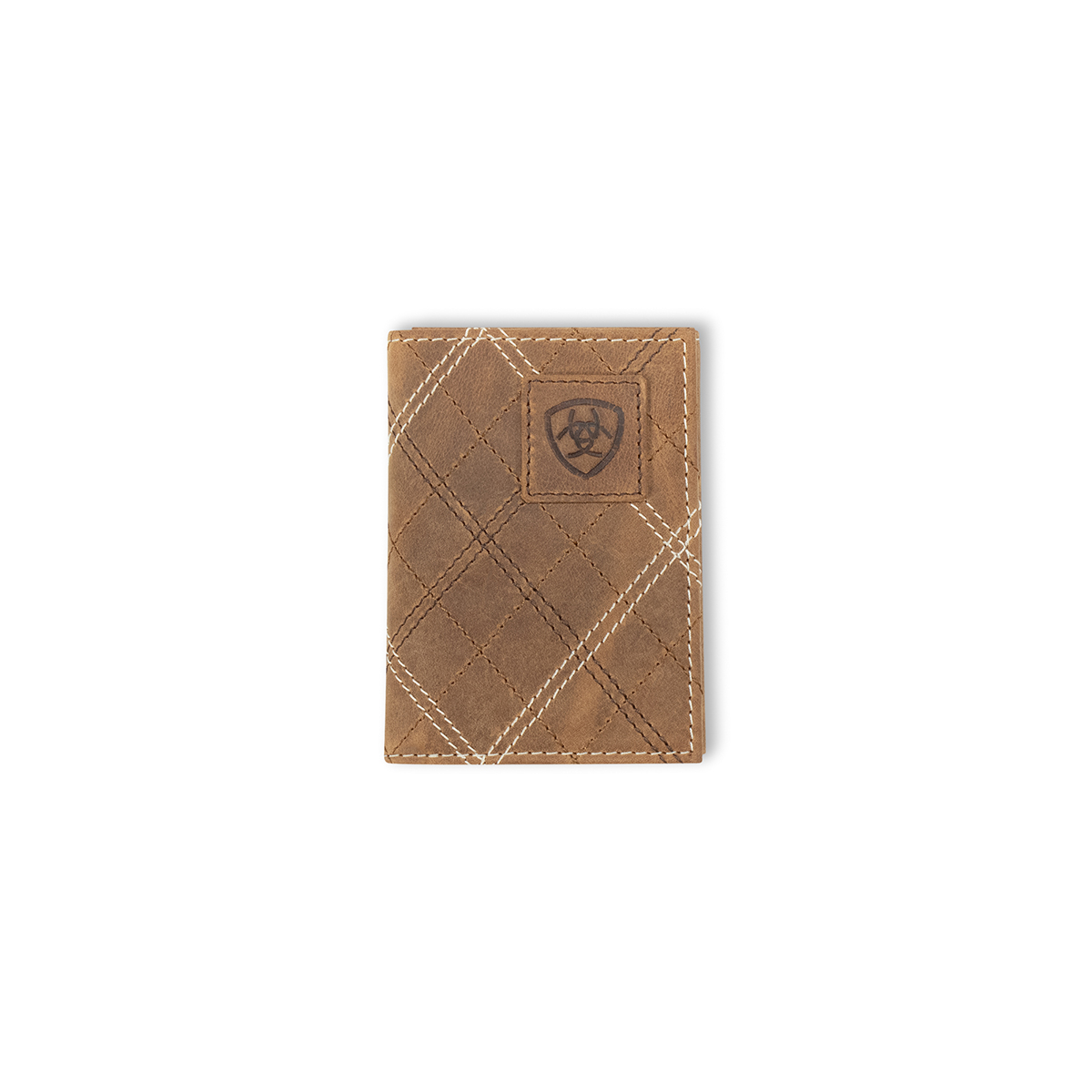 This Ariat trifold wallet by M&F Western Products is genuine crazy horse leather. Multi colored thread in cross stitched pattern along the body with an Ariat shield embossed patch on the front. Multiple card slots, cash slot and ID window on the inside.