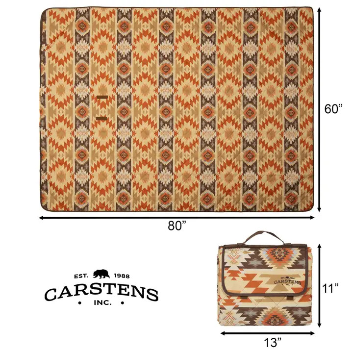 A perfect addition to your favorite outdoor brand, Carstens picnic blankets are ready for all settings, be it sand or grass. Waterproof backing and easily folded, means you can take this blanket with you everywhere. * Water repellent front and back polyester with a zipper on the flap * 80" x 60" * Machine wash cold, tumble dry low