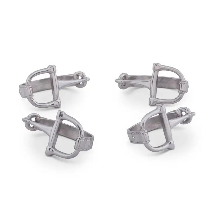 Unequivocally for the Equestrian Set, these Arthur Court Equestrian Napkin Rings are cast in the shape of a D Ring Snaffle Bit. The set of 4 napkin rings will rein in your napkins so they are a study in orderly beauty on your table. Dress your table in equestrian style with Arthur Court's Bit Napkin Ring Set. Hand-crafted and cleverly cast as miniature replicas of a D ring snaffle bit in shiny signature aluminum ally, this set of 4 adds polish to a themed Tablescape. Horse lovers will be delightfully surprised when they take their place at your table. Size: 2"L / 3"W / 2"T Care: Hand-wash in warm, soapy water, dry thoroughly.