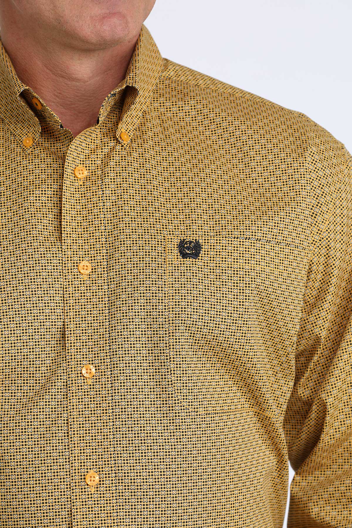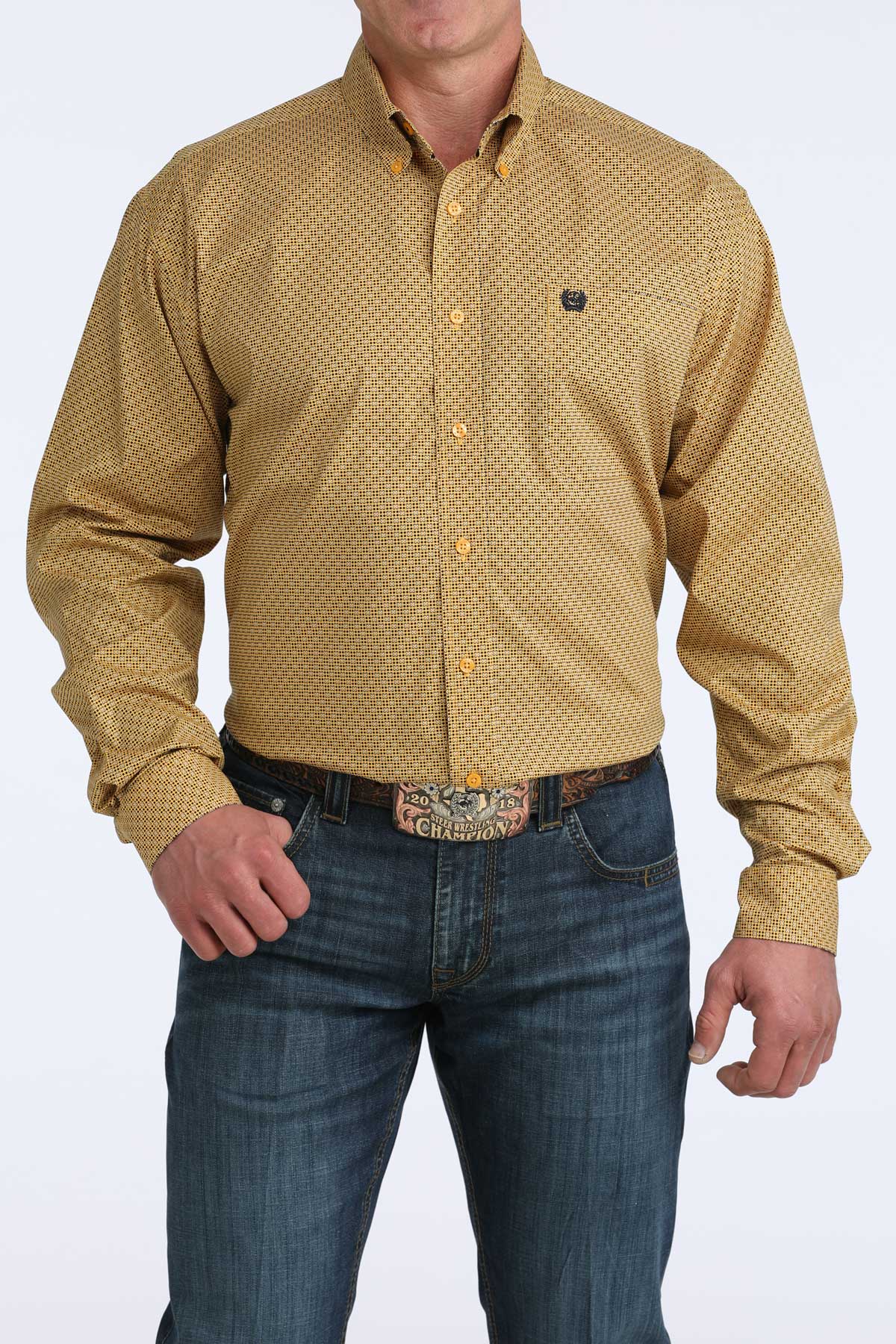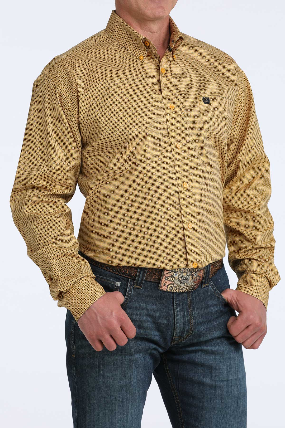 Upgrade your western wardrobe with this bold and stylish mustard yellow long-sleeve shirt. Designed with a subtle all-over geometric print, this shirt blends classic cowboy aesthetics with modern detailing for a sharp, versatile look.