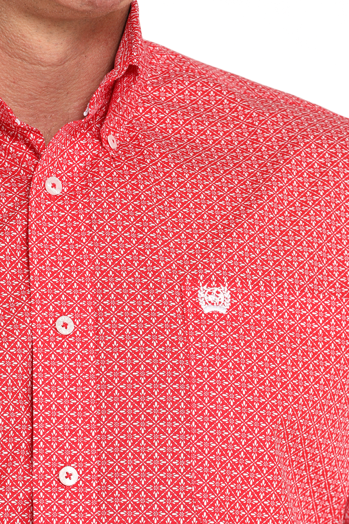 Crafted to style your way every day, this red cotton plain weave with allover geometric print is ranch-ready through and through. The perfect choice for pairing with new CINCH blue jeans, this novel shirt features an open left front pocket with embroidered logo and white buttons.