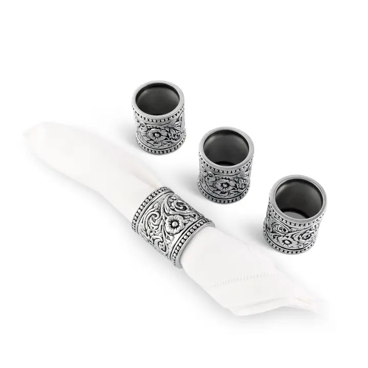 Create a blooming table setting with this set of four concho pattern napkin rings. These rings feature a delicate floral detail cast in lightly antiqued aluminum. Their circular shape seamlessly complements any decor. Let this napkin ring set add a fresh, regal touch to your tablescape for any casual or special occasion. These embellishments make an excellent gift for the consummate host, too. Size: 2.25"T x 2"W Care: Dust with a soft cloth