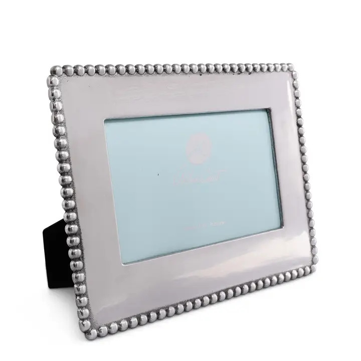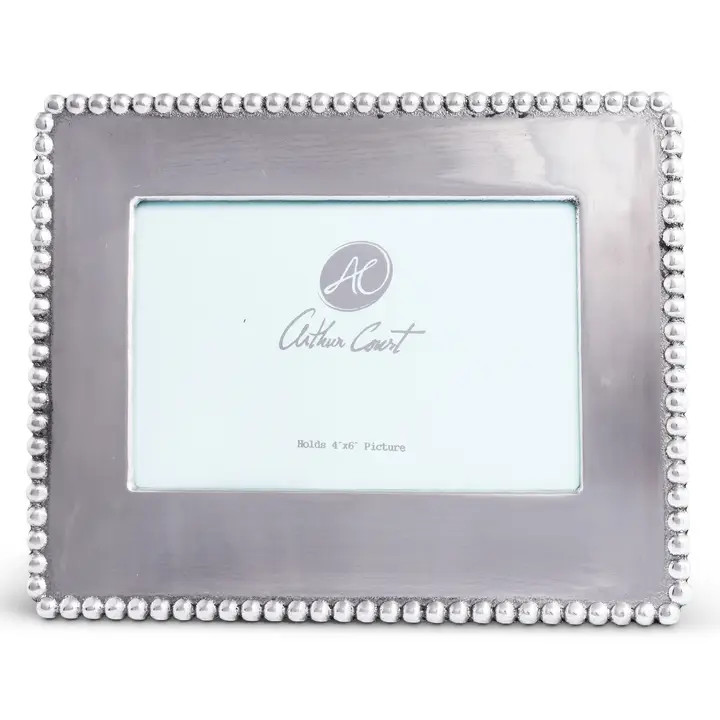 Create something unique with this engravable beaded photo frame from Arthur Court. The handmade aluminum frame is buffed to a bright shine and for a distinguished look. This large space is engravable to add names, dates or personal words anywhere around the photo. Shiny aluminum beads adorn the outside edge of the frame to add subtle yet elegant accents. The aluminum alloy does not tarnish so it will shine for years. The photo frame snugly holds a 4 x 6-inch image and will sit on a tabletop, desk or mantle to display photos of loved ones or pets. Keep this frame to create your own do-it-yourself personalized item or give as a gift for weddings, house warming parties, graduations or anniversaries. Heavy indents along the edge of this piece form a distinguished, beady border to surround the picture. Add your personal touch in between the lines for the final accent in this handmade, aluminum frame. Size: 4" x 6" Care: Dust with damp cloth. Will not tarnish