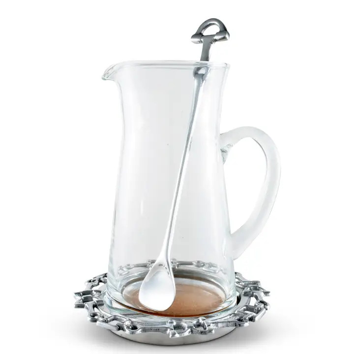 Each piece is made from handcrafted aluminum with intricate details that catch the eye. A removable cork sits at the bottom of the base to provide extra traction for the pitcher so it won’t scrape against the metal or slip from the base when the glass sweats. At 1.25 quarts, this dishwasher-safe glass pitcher holds enough liquid and ice for multiple drinks. Interlocking bits encircle the pitcher's handmade, aluminum base, which also comes with a removable cork. Another half-piece bit attaches to the ladle's long handle, forming a sturdy grip above the glass for stirring. Create favorite drink mixes for parties or evening cocktails in this Arthur Court equestrian pitcher set.
