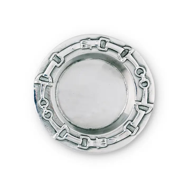 Turn riding into a romantic evening with this Equestrian Wine Coaster from Arthur Court. Leathery straps connect bits through interlocking squares to create a textured border around the edge of this piece. The symmetrical design accentuates the otherwise smooth finish of this handmade, aluminum coaster. Size: Diameter: 6.0" Care: Dust with damp cloth. Will not tarnish