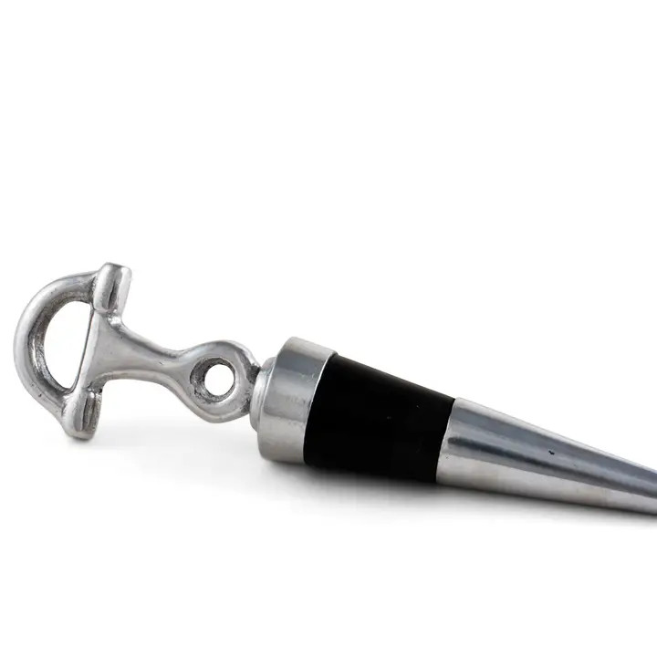 Maintain the quality of leftover wine with this Arthur Court Equestrian bottle stopper. Handmade from a premium signature aluminum alloy and shaped into a horse-inspired design, this stopper is both beautiful and functional. The rubber gasket creates a tight seal to preserve everything from a rich cabernet sauvignon to a light pinot grigio without excess oxidation, and the tapered point slides smoothly into the neck of your unfinished bottle. At 5.5 inches long, this piece slips easily into a server's apron so you can keep it on hand during parties. Whether you're hosting a fundraiser for your local stables or celebrating the acquisition of a new Arabian stallion with a group of friends, the bit-shaped handle sets the right tone for your event.