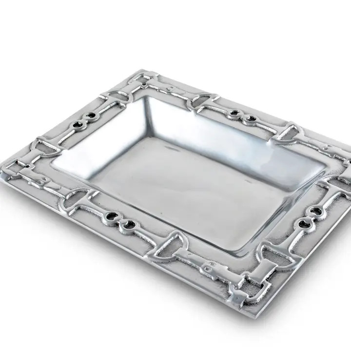 Merge your love of horses with the joy of hosting using this Equestrian Catch All from Arthur Court. Bits fasten together in exceptional symmetry along the entire edge of this piece, forcing your eyes to follow the sharp angles in their design. Let the superior craftsmanship of this handmade, aluminum dish draw guests in towards the food you place inside it. Size: L: 10.0" / W: 7.0" / H: 1.0" Care: Wash by hand with mild dish soap and dry immediately - do not put in dishwasher.