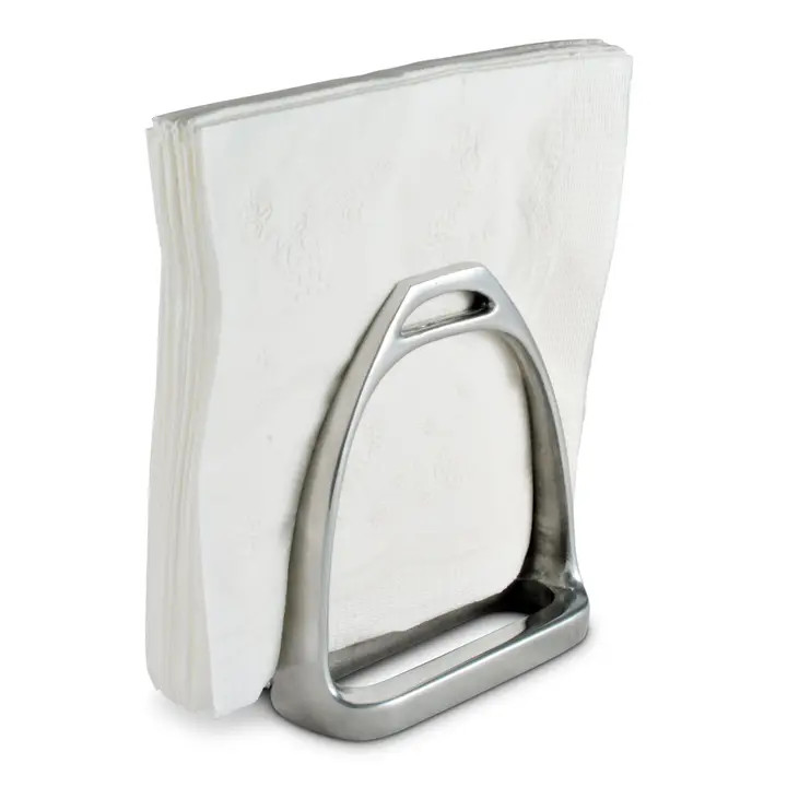 Proclaim your Equestrian lifestyle with functional, hand-crafted aluminum artwork. Detailed, realistic stirrup irons, hand-crafted stand to display and dispense napkins on your table or counter. Standing design allows for easy dispensing at any time. Size: 5" H x 3.5" W x 4.5 L Care: Dust with damp cloth. Will not tarnish.