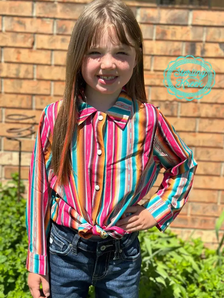 Stay rad under the sun in the Feel The Sunset Top Kids! Featuring a classic serape pattern, this cool, colorful button up is the perfect way to stand out in style. Plus, you'll look so cool you'll have your friends wishing they were the ones catching rays!⛱ 95% polyester 5% spandex