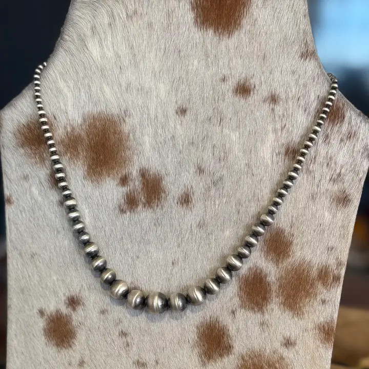 22" Graduated Sterling Silver Pearl Necklace- This elegant 22-inch necklace features hand-polished sterling silver round pearls in a classic graduated design, ranging from 4mm to an eye-catching 14mm. The smooth, hand-polished finish and timeless silhouette make it a perfect piece—perfect for layering or as a bold statement. SKU: ZB 32
