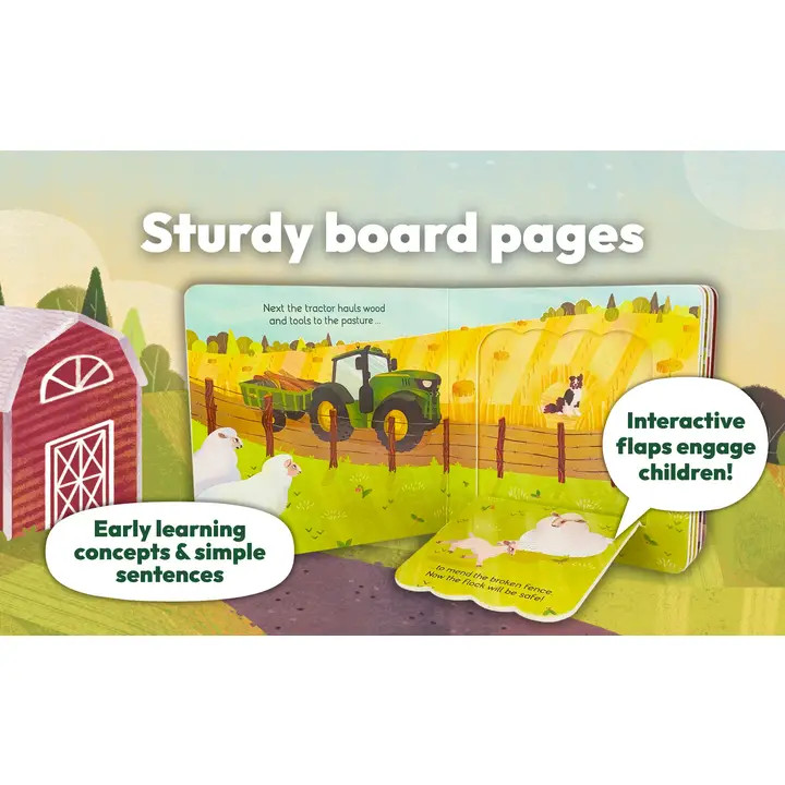 Nothing runs or reads like a great farm book! Introduce your little one to all the friendly animals on the farm with this adorable and sturdy board book filled with lively rural scenes and tractors designed to educate and entertain your little one. Simple sentences reinforce future language structure while grasping and lifting the durable flaps helps develop fine motor skills. A perfect first book for farm discovery!