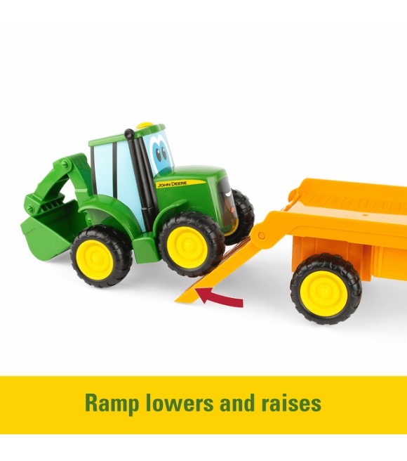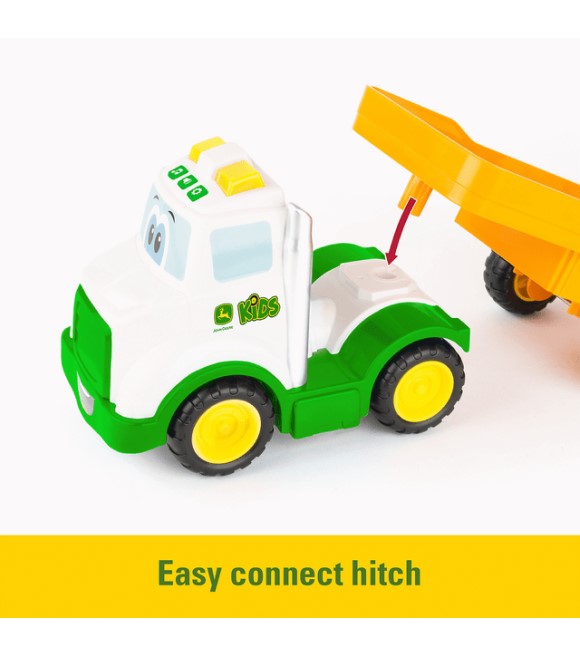 help your little one get their farm friends from job to job with the John Deere Lights & Sounds Farmin' Friends Hauling Set! This fun farm duo includes a truck with a ramp that raises and lowers, making it easy for the tractor to roll up on board. The hauler truck features lights and sounds for extra fun during playtime and can also be used to haul other Johnny Tractor vehicles. Both toys have free rolling wheels for plenty of push along fun.