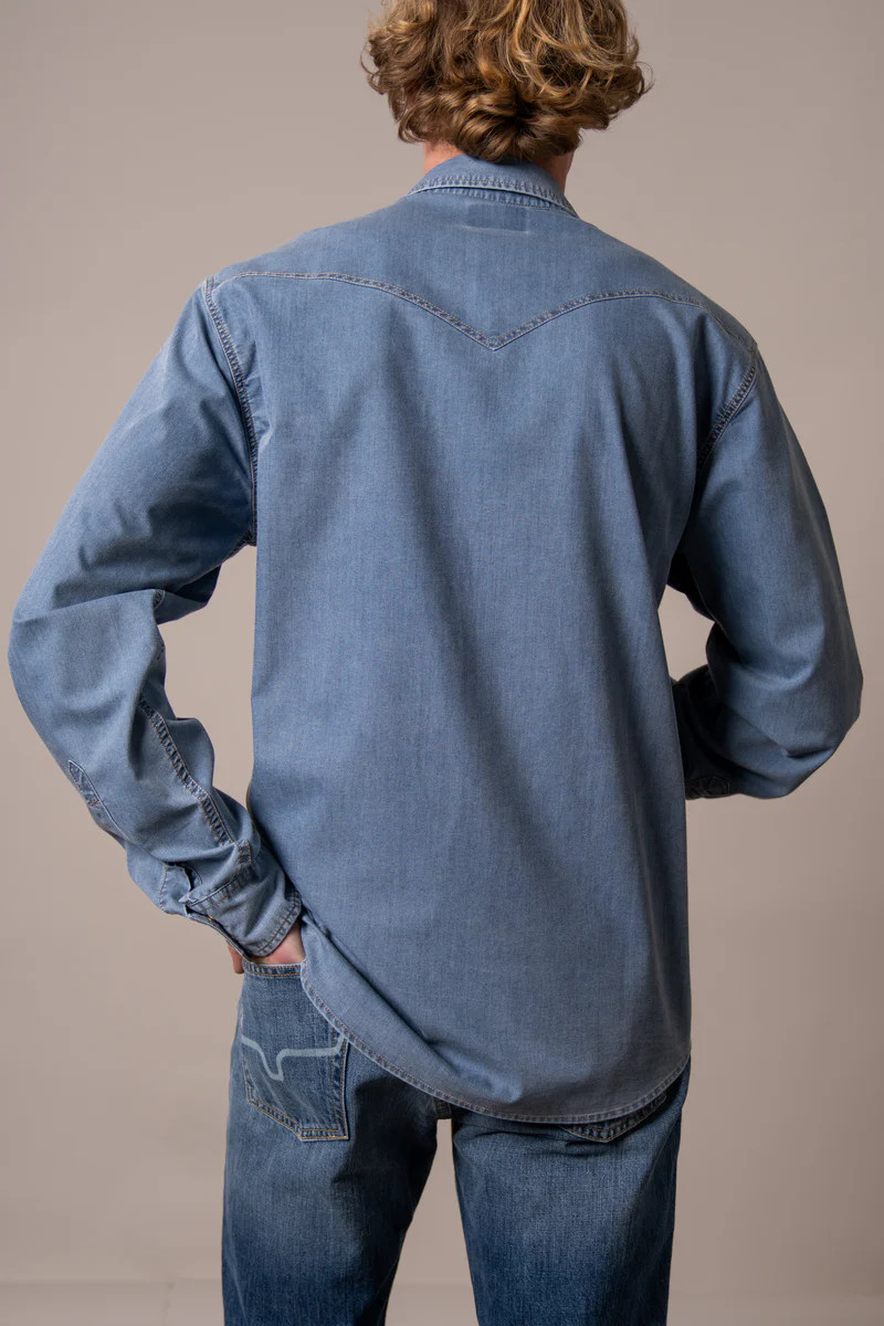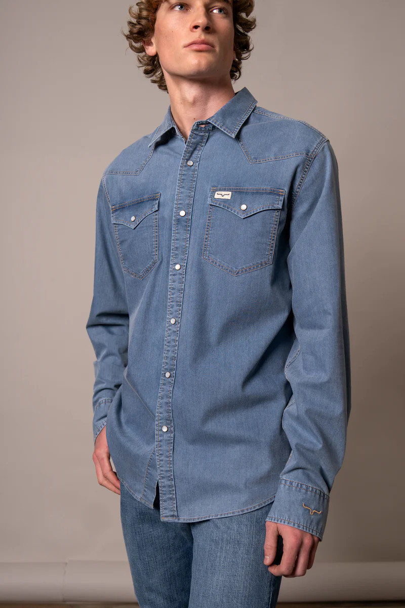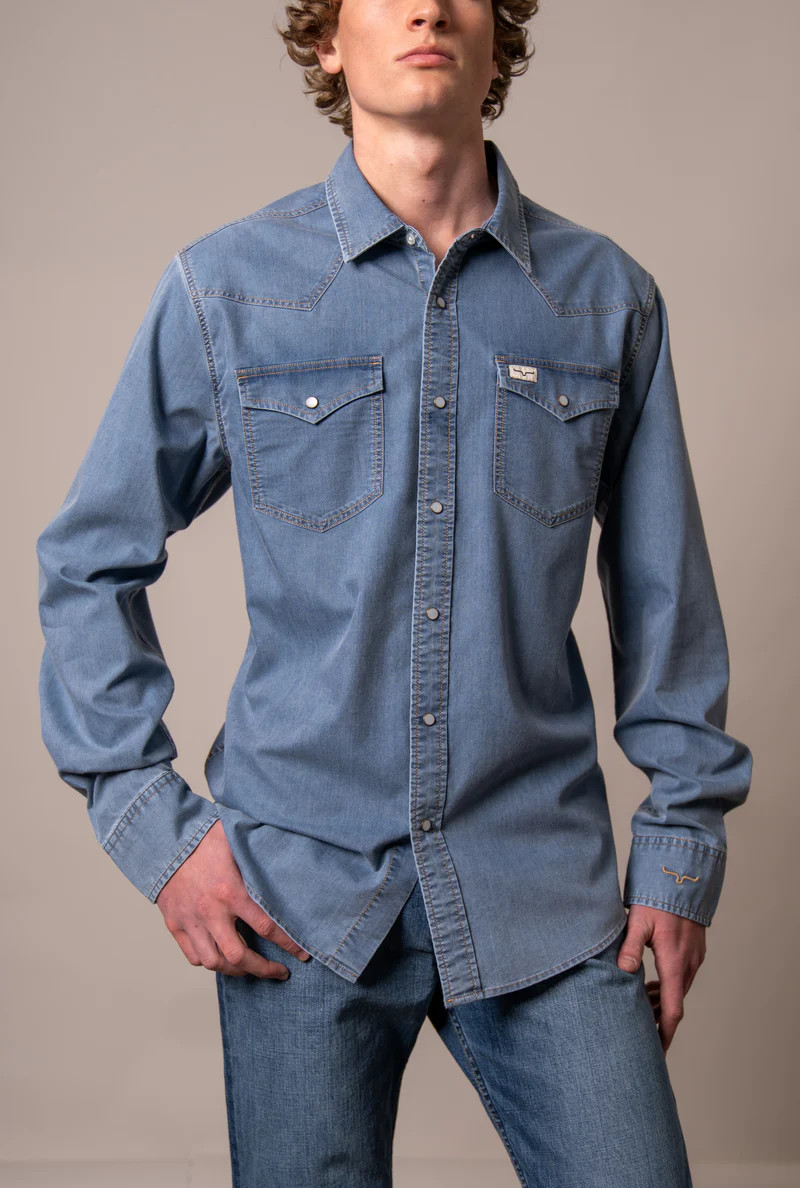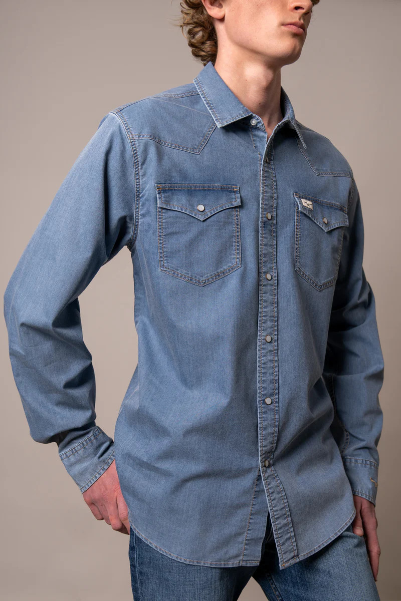 Embrace the traditional spirit of the West with this denim collared long sleeve, a timeless classic reimagined for the modern cowboy. This iconic button-down features pearl snap closures down the front and on the double chest flap pockets, complemented by a stylish Western yoke that never goes out of style. The Cleavon is built with Coolmax technology to ensure breathable, lasting comfort, making it versatile for everything from a hard day's work to a sharp evening event. Its quality is undeniably Kimes Ranch, ensuring it's not just easy to wear, but built to endure.