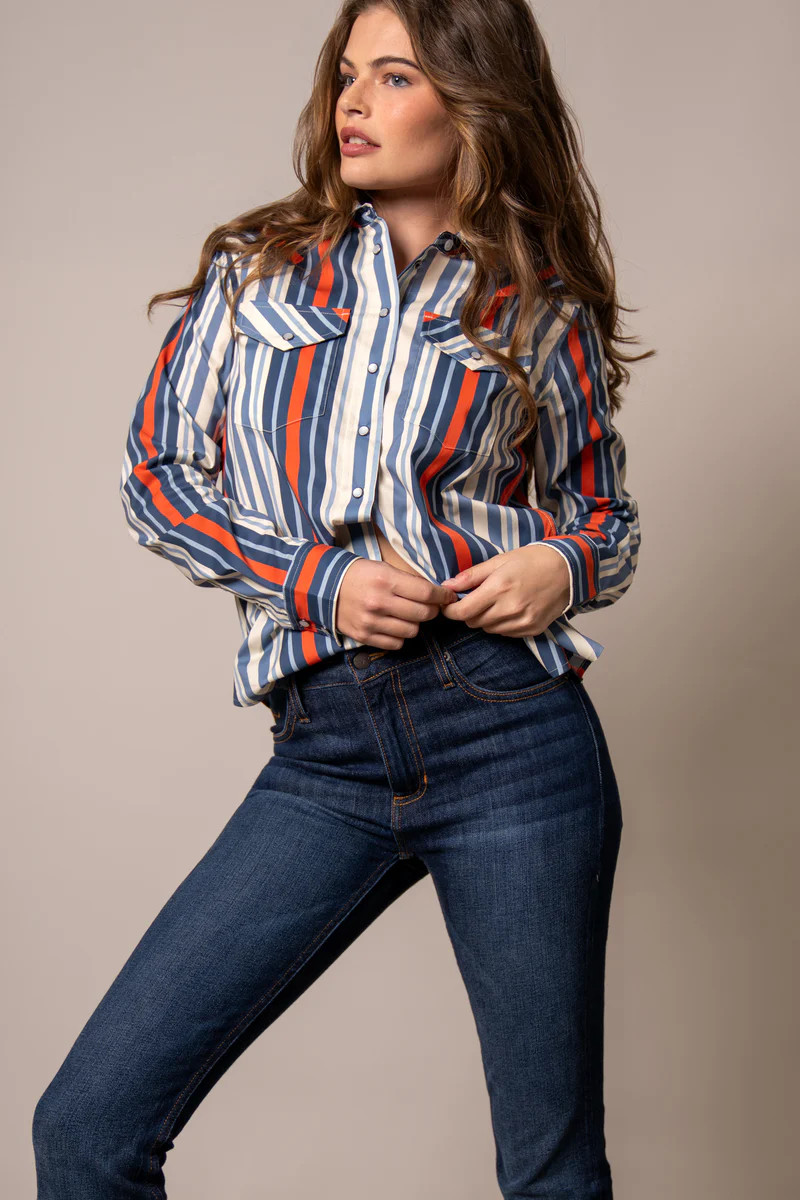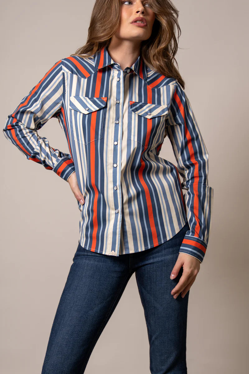 The Kai is designed to turn heads with a bold striped look that blends western style with modern personality. Vertical multi-color stripes create a striking silhouette, giving the shirt a dynamic feel that stands out in any setting.