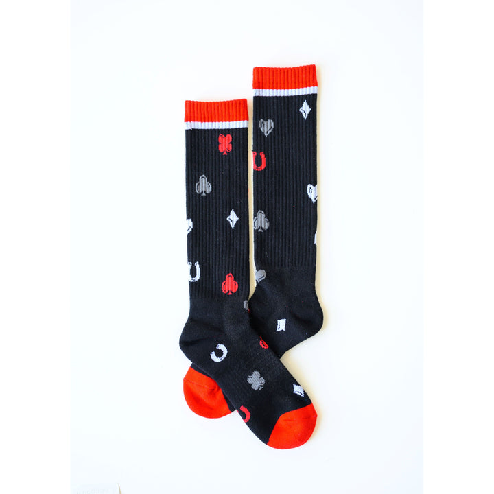 Designed by head cowgirl Lorinda Van Newkirk, it’s no surprise these riding essentials come pack with style and well-thought-out design. They are tall enough and stay up to protect your calves and never cut the circulation off. Lucky Chuck Performance Socks softens with every wash, but without wearing out ~ meaning even more chances to wear your lucky socks every day. Everyone deserves to wear a pair of LUCKY Chuck SOCKS!!