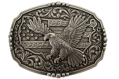 American Flag and Scroll Design, Raised Engraved Eagle Motif, Antique Silver Finish. 99% Zinc, 1% Iron.