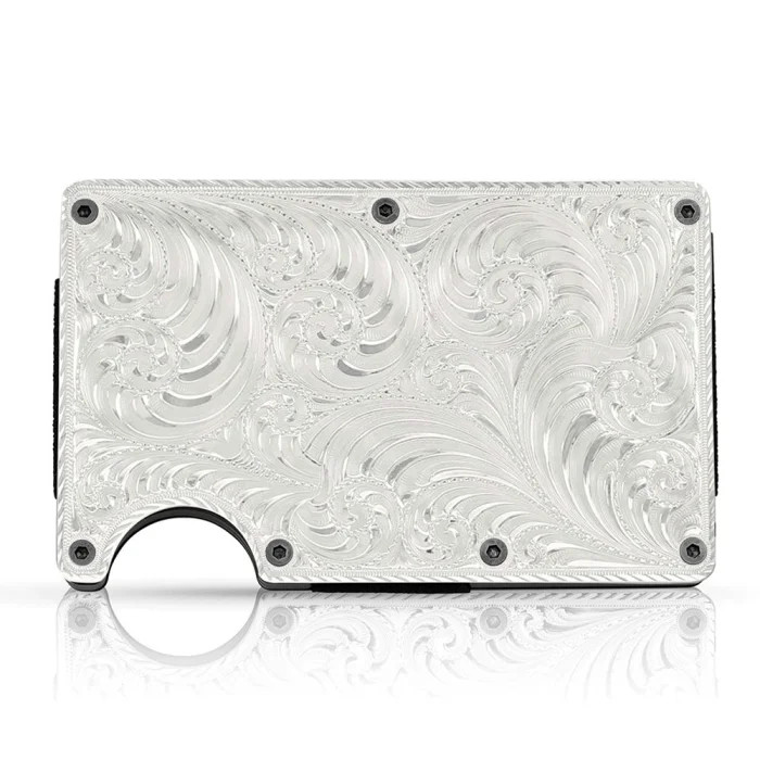 The Montana Credit Card and Cash Clip offers a distinctive, slim design that is practical and comfortable in your hand and pocket, making it an everyday essential. A great way to inject that extra touch of personality into your day this credit and cash holder is bright on one side with a silver finished panel of Montana Silversmiths signature bright-cut engraving. The opposite side has a clip that can hold your cash. Holder expands to hold a multitude of cards with thick elastic bands.