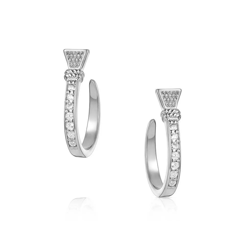 The Rustic Serenity Hoop Earrings are perfect for any occasion. These simple silver tone hoops are secured by a hinged clasp for effortless wear. An engraved design runs through the center of each hoop, adding a unique and eye-catching detail to their timeless silhouette.