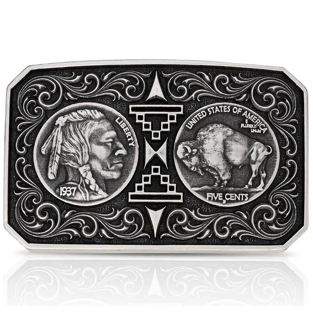 Take the West with you. The Westward Way Buckle features a dark antiqued silver tone design. The square shape features bold silver tone filigree in the background that complements the buffalo nickel design in the center highlighting both the front and back side of the coin. A Southwestern pattern in the center separates the two coins. The buckle has a standard 1.5 inch swivel.