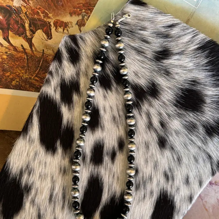 Black Onyx & Sterling Pearl Bead Necklace – 20 inches of striking contrast authentic of deep black onyx beads paired with hand-polished 10mm round sterling pearls and accented by an 8mm sterling silver saucer pearls. Elegant and versatile, this piece adds a touch of sophistication to any ensemble. Length: 20" Materials: Sterling silver pearls, authentic black onyx Pearl Sizes: 8mm saucer & 10mm round Finish: Hand-polished Style: Southwestern, boho-chic, cowgirl, chic, classic, versatile layering
