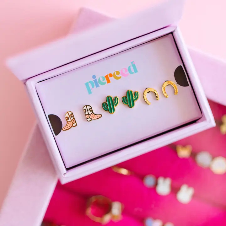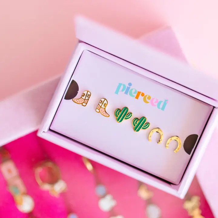 Get ready to level up your piercing game with our Bestselling Western Screwback Set—three fan-favorite styles that customers absolutely love. Each piece combines secure screwback functionality with stunning designs that work for any vibe. Whether you're mixing and matching or finding your signature look, this curated trio delivers quality and style without the guesswork. Perfect for building your collection or gifting to a fellow piercing enthusiast! Materials * Surgical grade stainless steel * 18K gold plated * Lead & nickel free * Enamel * Always hypoallergenic Details * Flat screw-back * Ultra-thin post measuring .8mm (20 gauge) * 8mm post * Waterproof - can be worn in the pool and bath Exclusive Pierced Co Extras