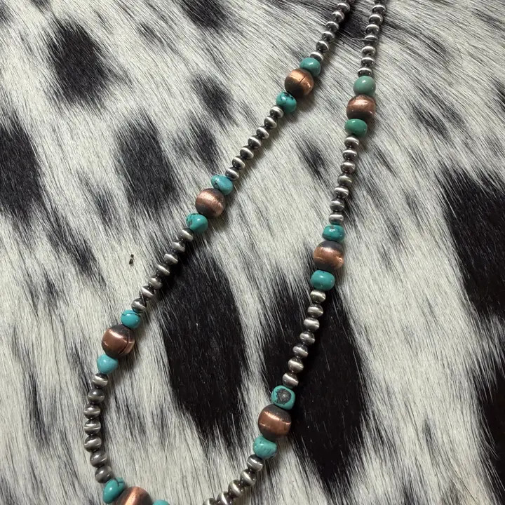Striking and sophisticated, this copper and sterling silver necklace blends warm earthy tones with cool classic shine. Rich copper elements bring a bold, rustic glow, while sterling silver accents add timeless elegance and beautiful contrast. This mixed metal necklace with Genuine turquoise is the complete package.