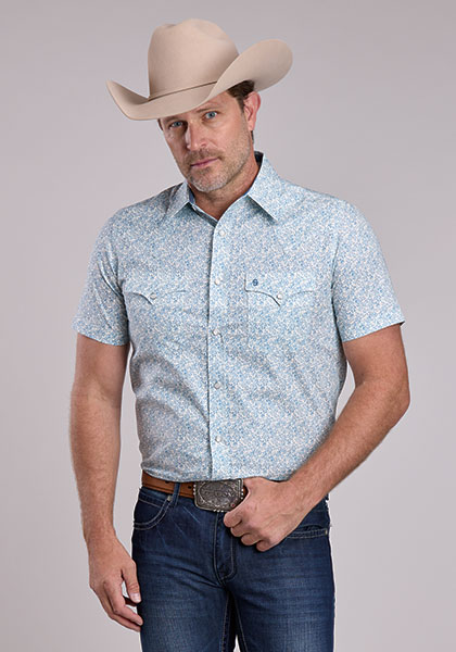 Stetson Allover Print On Cotton Poplin * 1 Pt Ultra Deep Curved Back Yoke * Stetson "S" Emb * Chambray Inside Trim * Logo Pearl Snap Front * Standard Fit |
