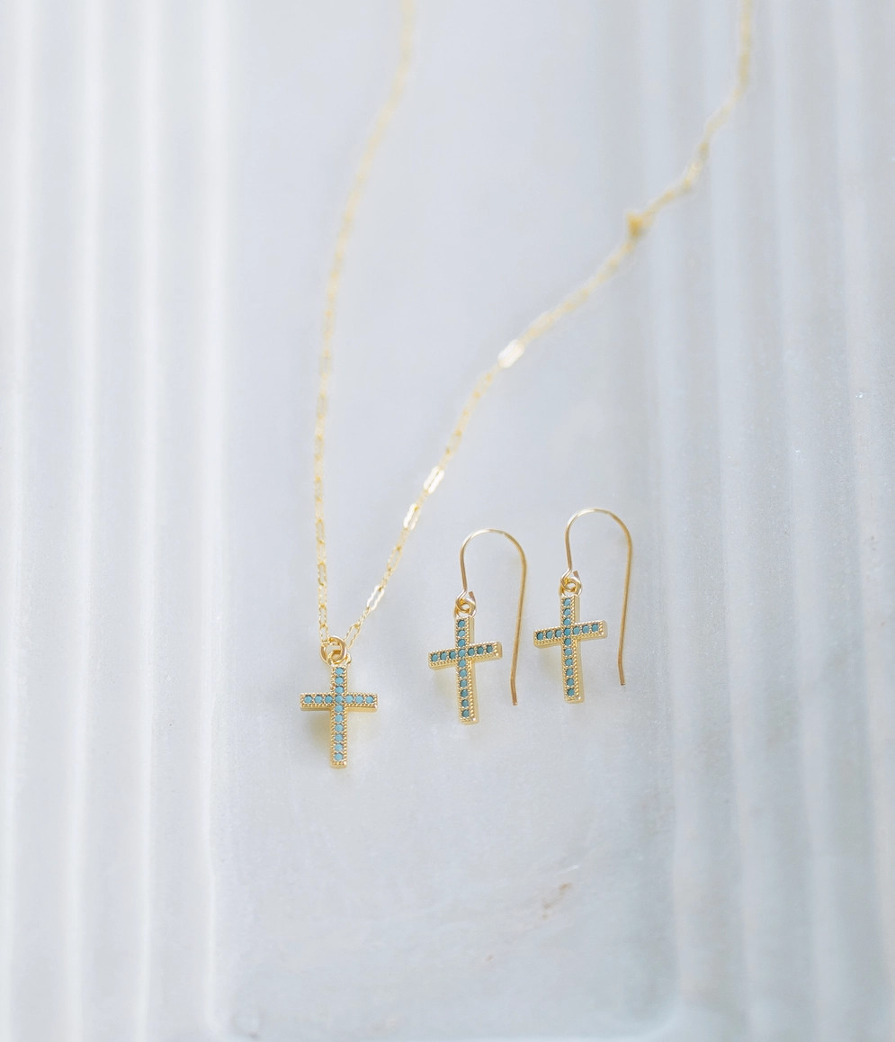 Choose Options STEVIE CROSS NECKLACE GOLD MSRP: Was: Now: $54.00 18k gold filled cross featuring turquoise blue cubic zirconia's 14k gold crinkle 18” chain