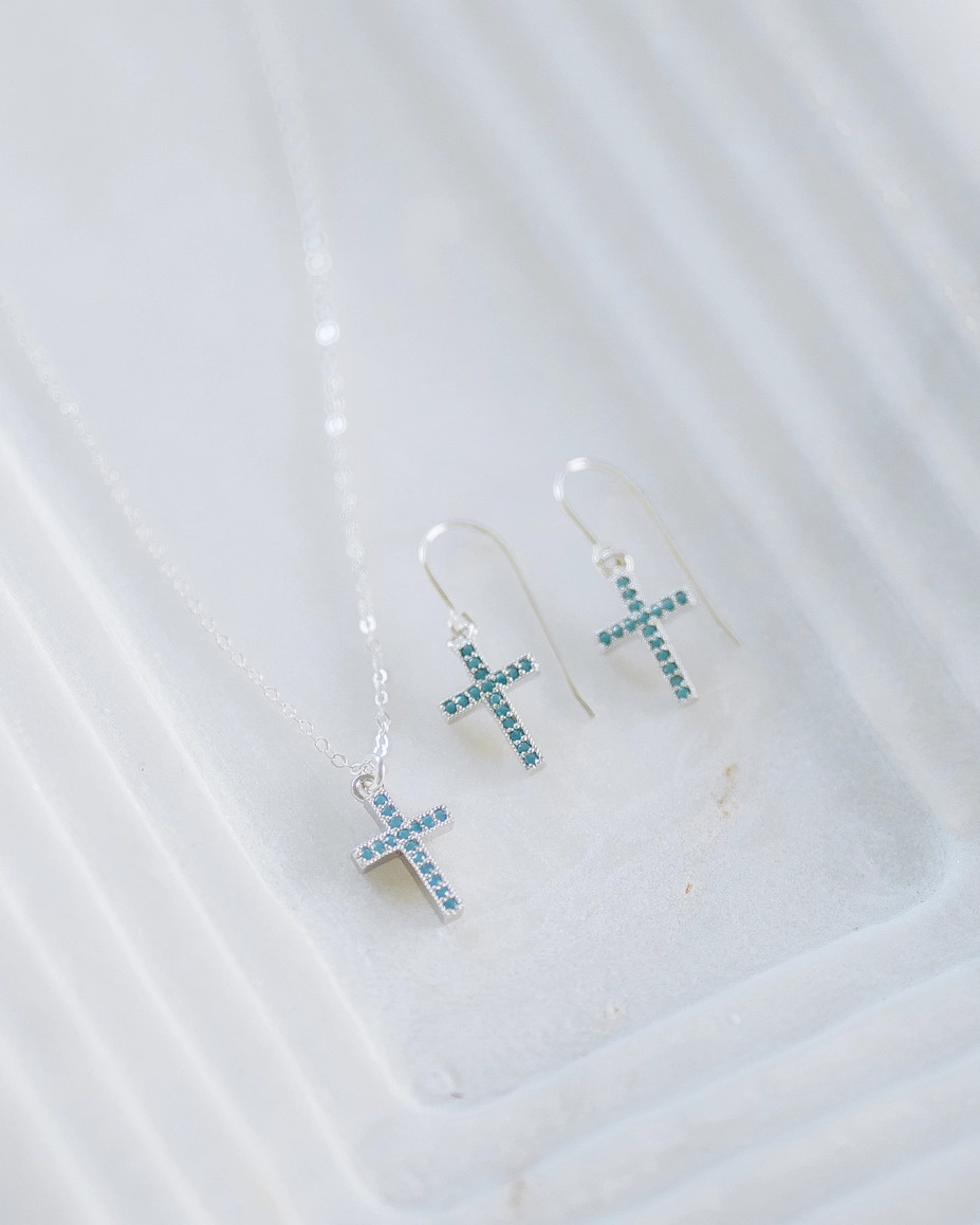 Choose Options STEVIE CROSS NECKLACE SILVER MSRP: Was: Now: $54.00 18k gold filled cross featuring turquoise blue cubic zirconia's sterling silver 18” chain