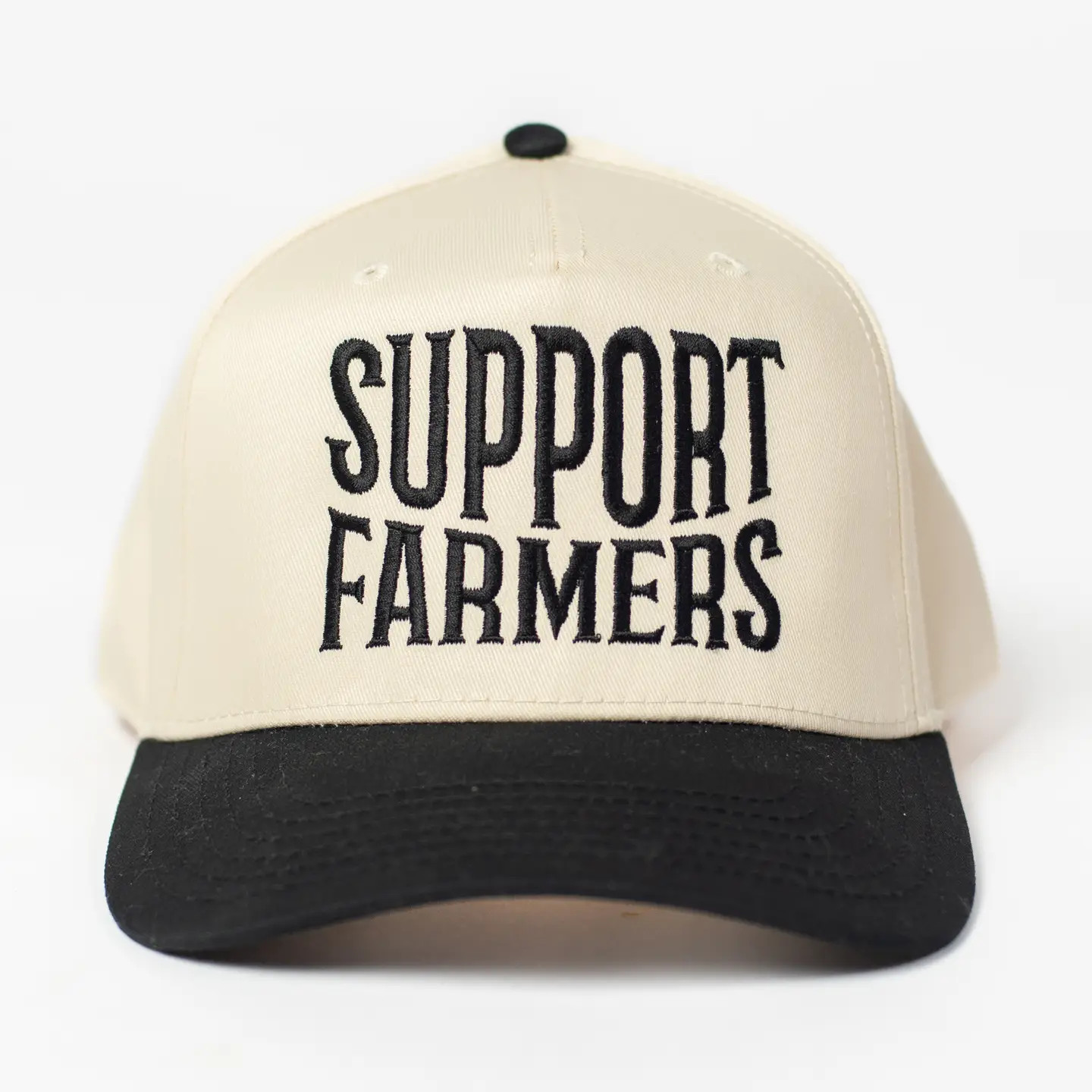 Stand out in the crowd with our 'Support Farmers' Embroidered Trucker Hat! This cream hat with a black bill and bold embroidery will not only make a statement, but show your support for farmers. Wear it proudly! Specifications: Cream/Black 65% polyester 35% Cotton Unstructured, five-panel, high-profile Snapback closure FINAL SALE HG-01-076