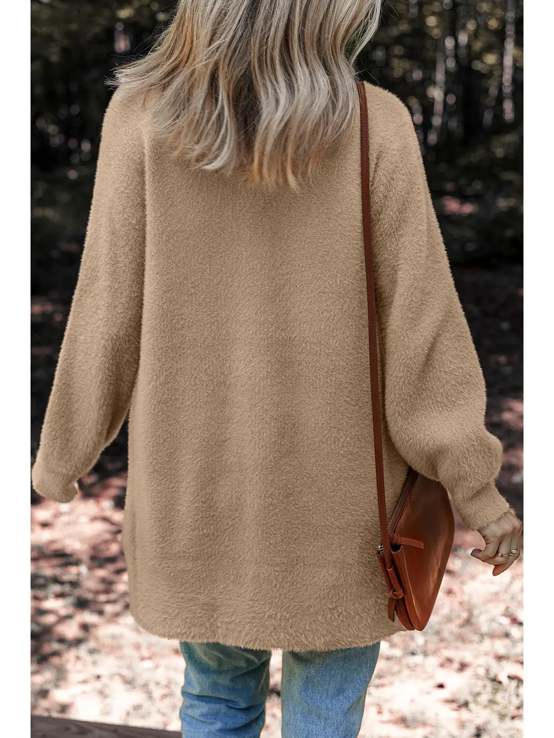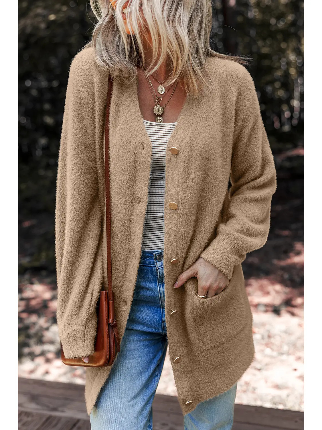? Simple solid color design looks chic and modern. ? Midi length, button front, and handy side pockets. ? Soft, warm, and comfy thanks to fuzzy knit fabric. ? Easy to pair with jeans, dresses, or skirts.