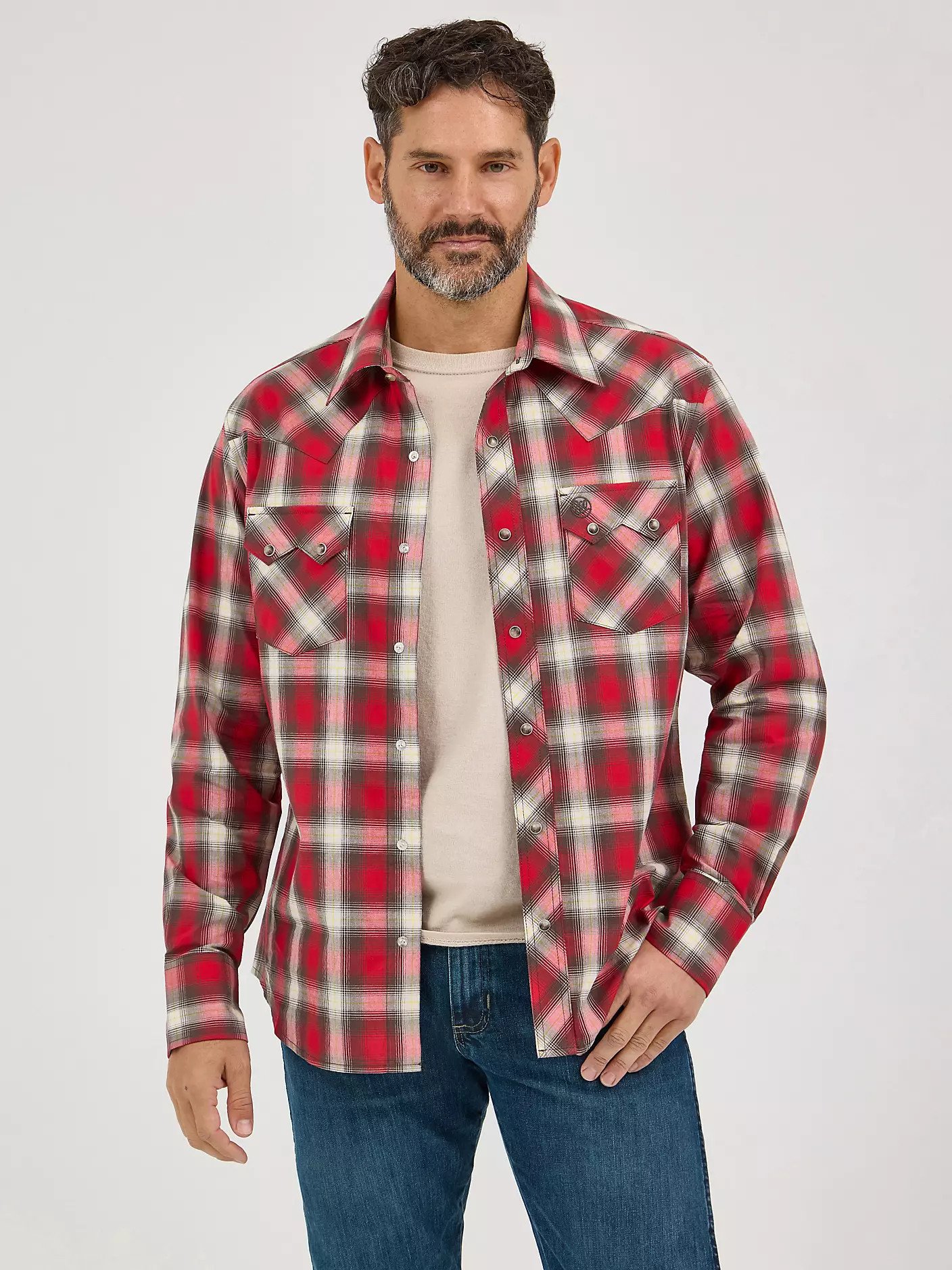 Paying tribute to our Western roots, the men's Wrangler Retro® long-sleeve sawtooth snap pocket western shirt gives the classic style you know a modern look and feel. It comes with all the same details you love, including a spread collar, pointed yokes, and two sawtooth snap flap pockets with embroidery to add a bold element to every outfit. Plus, it features a modern fit and it's crafted from cotton for comfort and long-lasting durability, no matter how often you wear it. Wear it with a pair of Wrangler Retro bootcut jeans to complete the look for any occasion.