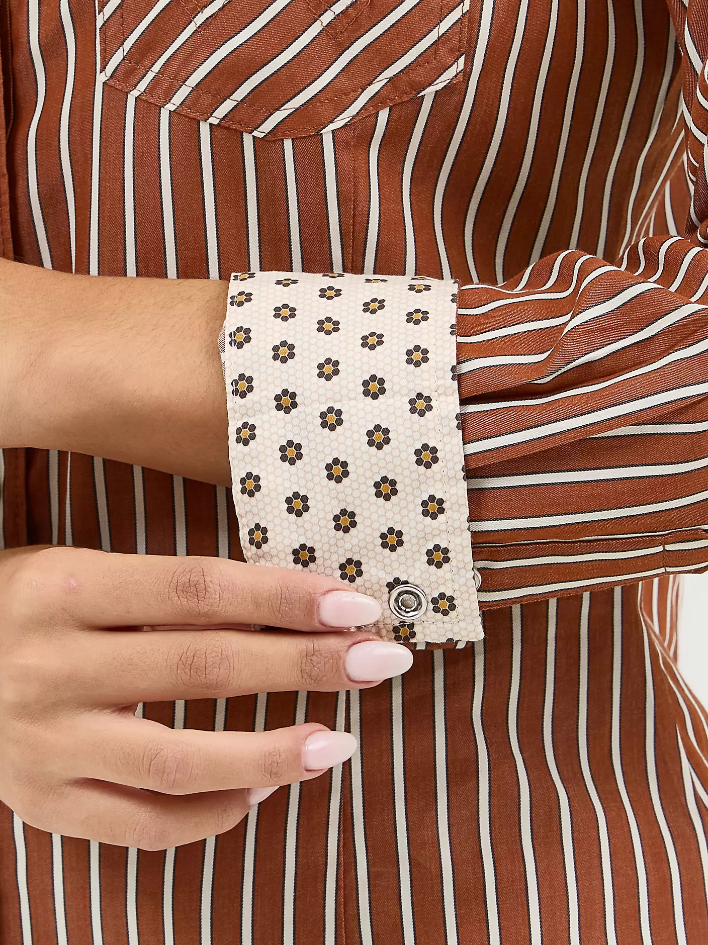 A cowgirl can never have too many collared shirts for competition and daily life. Our Women's Wrangler Retro® All-Occasion Western Snap Dress Shirt is crafted a lightweight cotton and recycled materials blend that will keep you comfortable in everything you do. It comes with pointed yokes, pearl snaps, two chest pockets with the signature "W" stitching, and a contrast print at the cuffs.